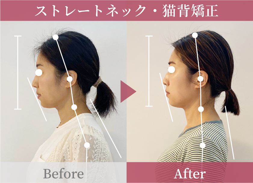 身体の骨格全体を整えることで、小顔だけでなく姿勢矯正も。頭のサイズダウンや、首・腰の位置が変わることで美しい姿勢になったとお喜びいただいております。
