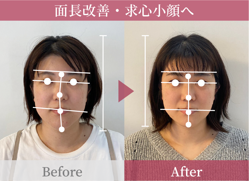 顔全体の形がスッキリしました。広がっていたパーツが中心に寄ることで綺麗な求心小顔に。顎の歪みが整い、噛み合わせまでもよくなったと実感しています。