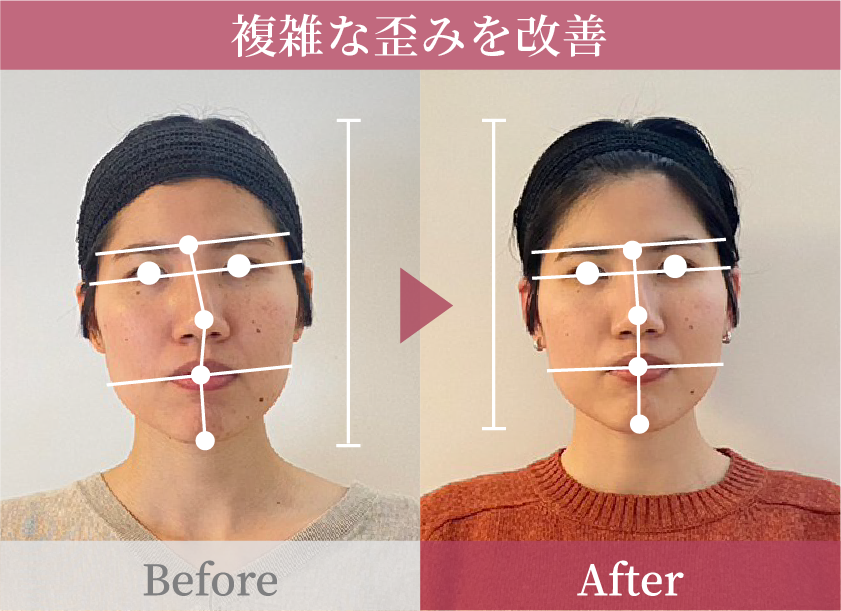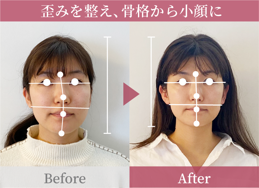 顔の骨格の歪みが整い、顔のサイズが大幅に小さくなりました。リフトアップして輪郭が小さくなったことで、施術前に比べて顔のパーツが大きく見え、印象も変わったと言われました。